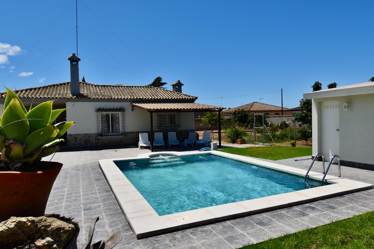 Villa charmante et confortable avec piscine privée à Chiclana de la Frontera, Costa de la Luz, Espagne pour 6 personnes. La maison de vacances est située dans une région balnéaire, à 4 km de la plage de La Barrosa et à 4 km de La Barrosa.
