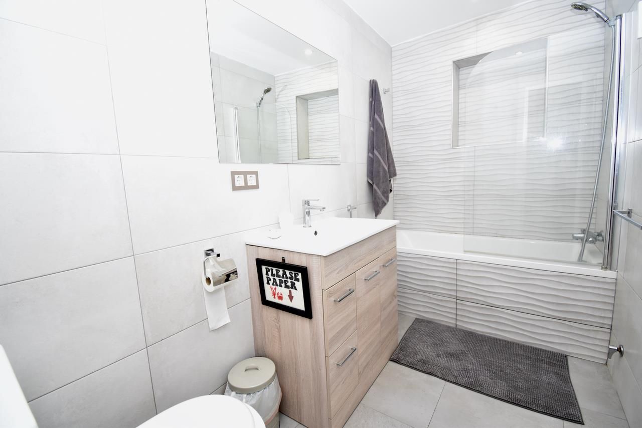 • salle de bains attenante avec lavabo simple, combinaison baignoire/douche, et toilettes