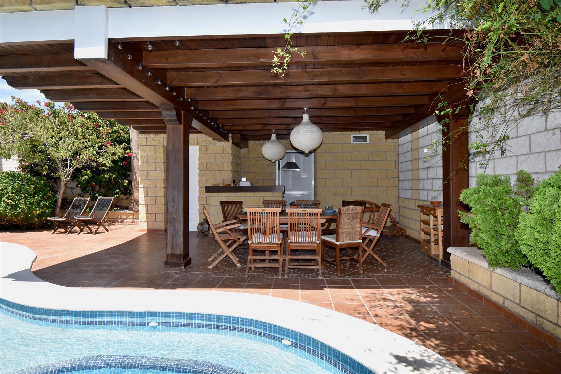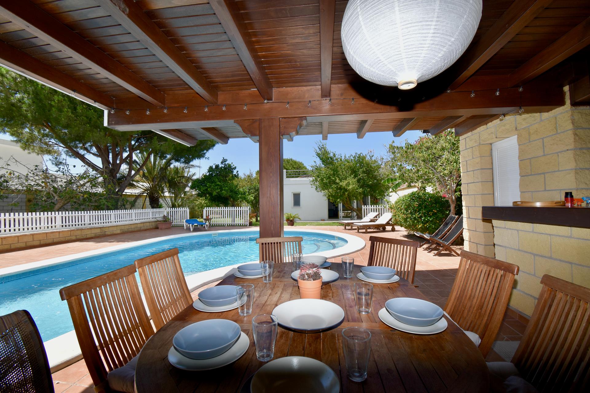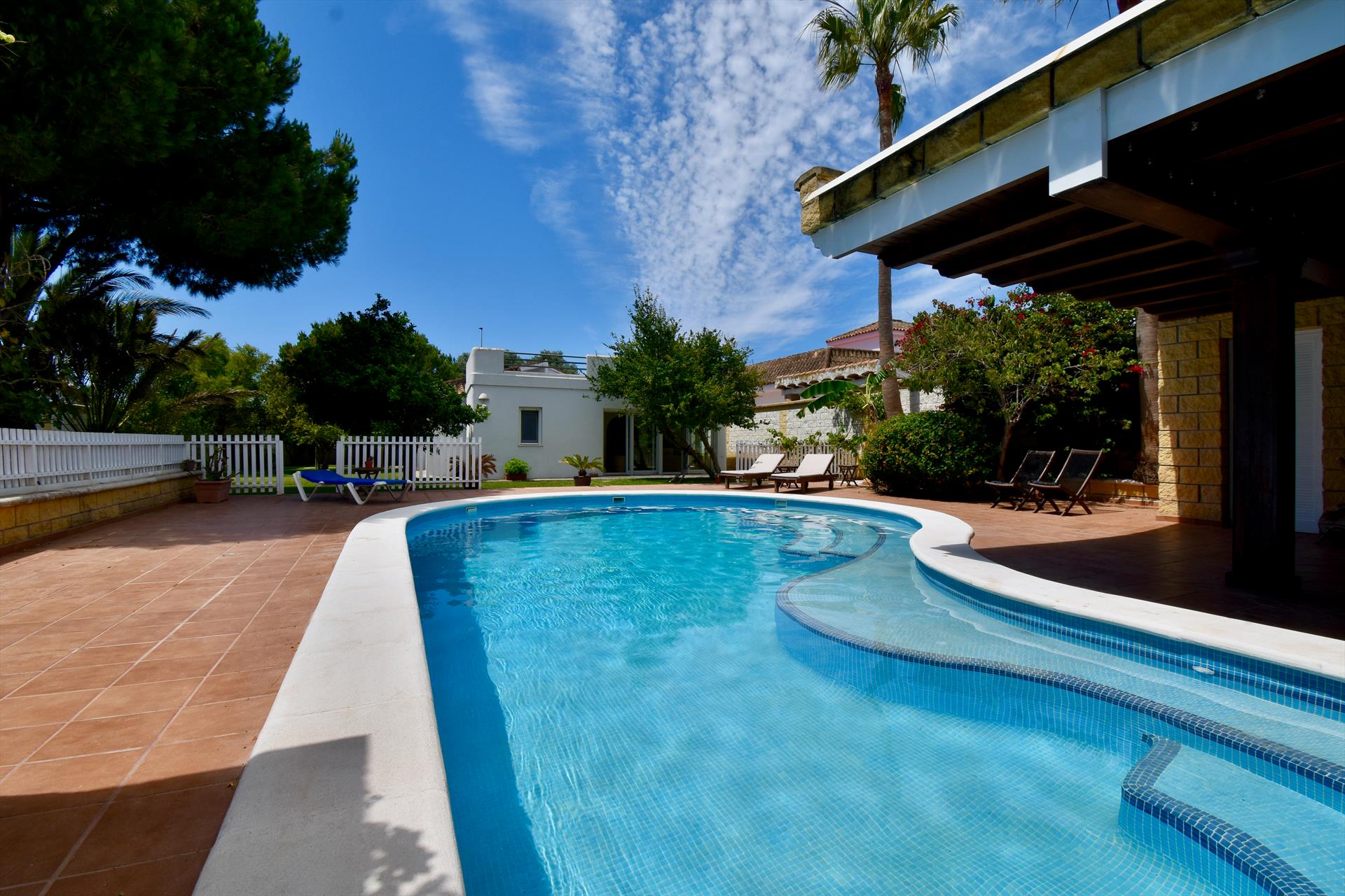 Belle et confortable villa avec piscine privée à Chiclana de la Frontera, Costa de la Luz, en Espagne, pour 12 personnes. La maison est située dans une zone urbaine de plage, à proximité de restaurants, bars, supermarchés, et à 2 km de la plage de La Barrosa.