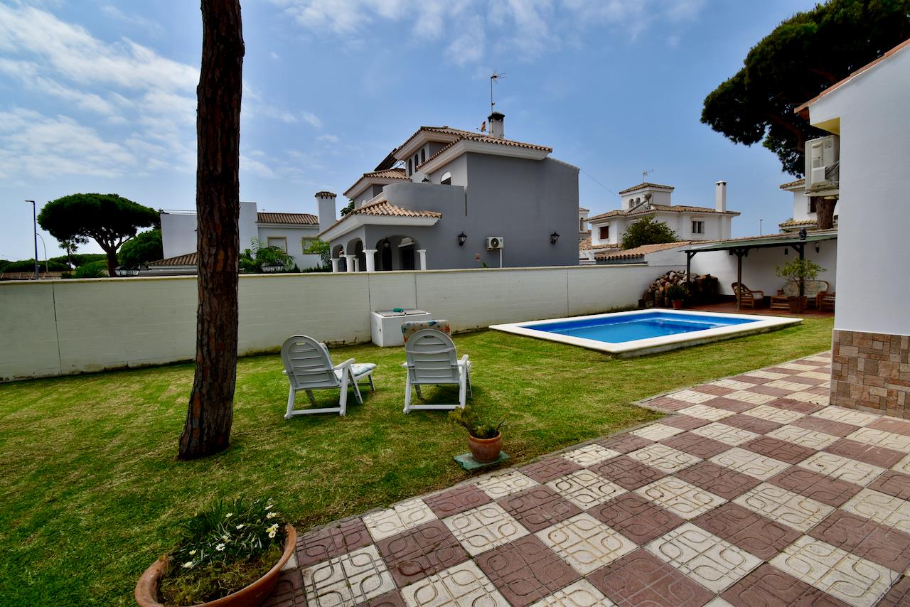 Villa classique et charmante à Chiclana de la Frontera, Costa de la Luz, Espagne avec piscine privée pour 6 personnes. La maison de vacances est située dans une région balnéaire et résidentielle, près de restaurants et bars, de magasins et de supermarchés et à 200 m de la plage de La Barrosa.